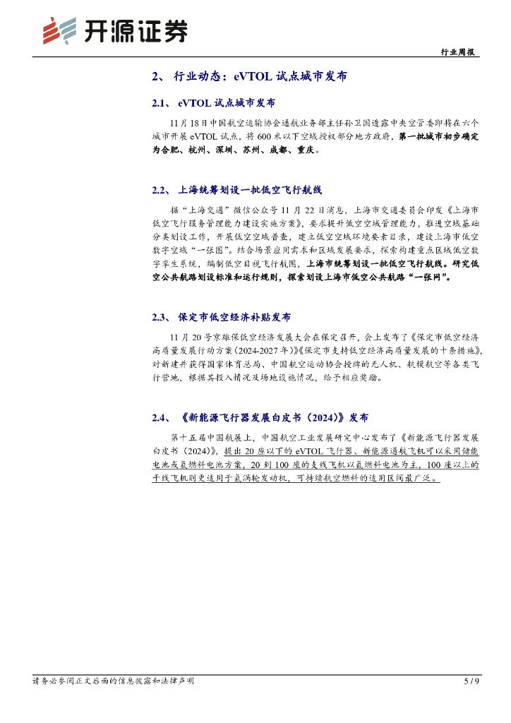开源证券:电力设备:低空经济行业周报(11月第4周):eVTOL第一批试点城市或将发布,空域管辖权授权给地方政府.pdf
