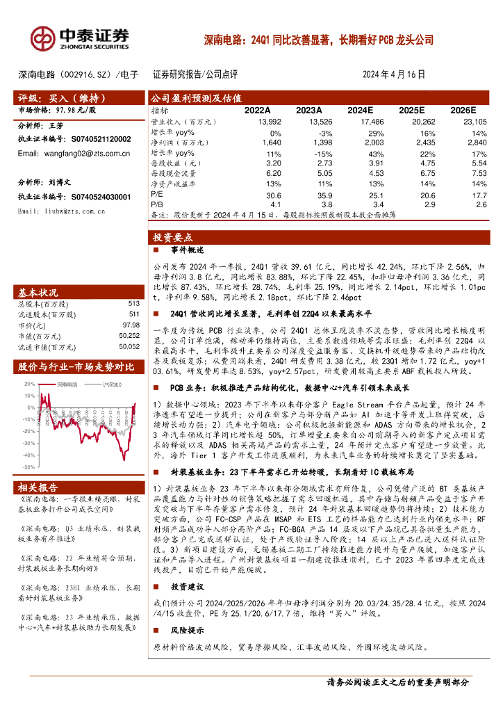 中泰证券:深南电路:24Q1同比改善显著,长期看好PCB龙头公司.pdf