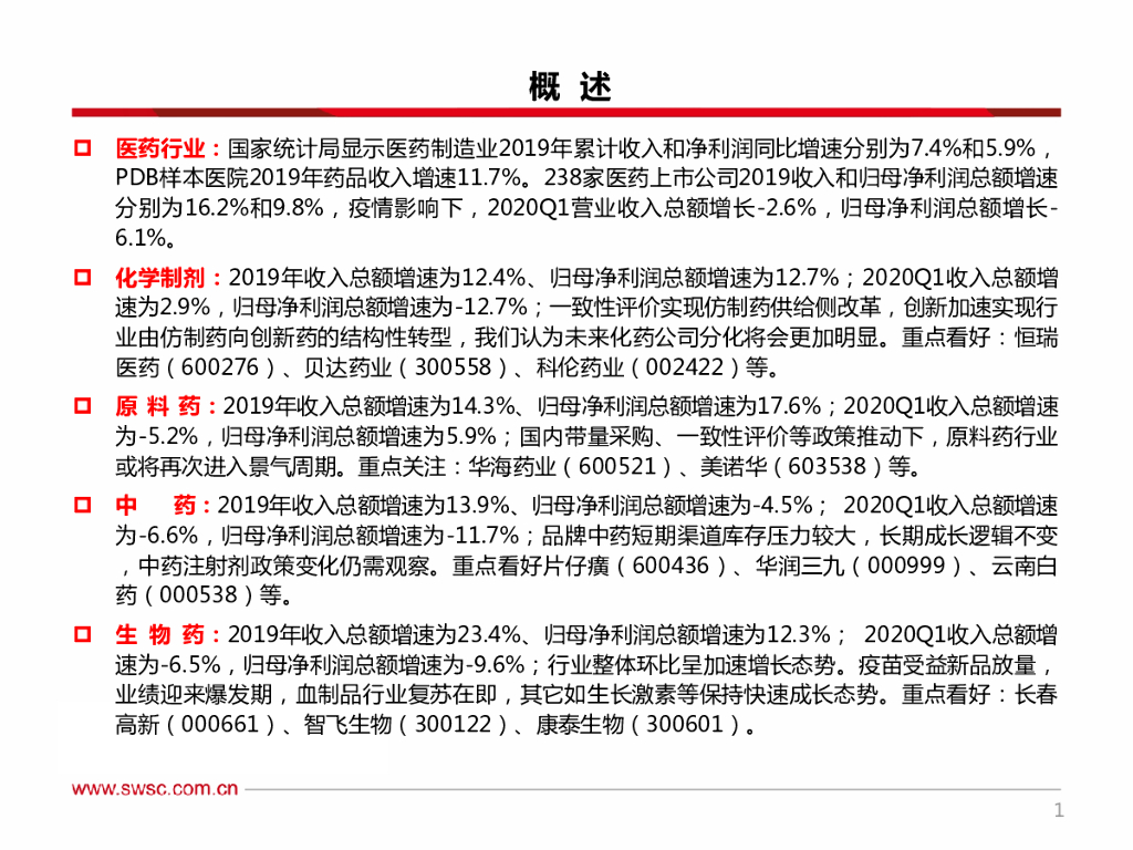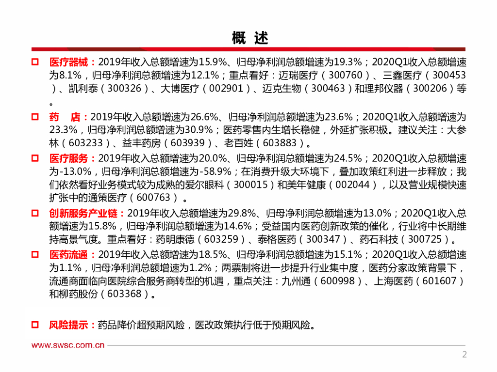 西南证券:医药行业2019年报及2020一季报总结:数据会说话,医疗器械、原料药、药店及创新药产业链表现亮眼.pdf