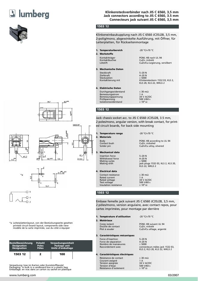 LUMBERG Klinkensteckverbinder nach JIS C 6560, 3,5 mm Jack connectors according to JIS C 6560, 3.5 mm Connecteurs jack suivant JIS C 6560, 3,5 mm 数据手册.pdf