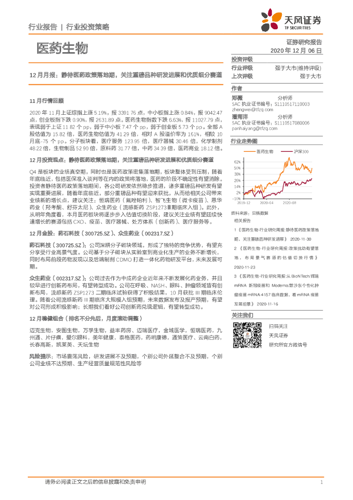 天风证券:医药生物12月月报:静待医药政策落地期,关注重磅品种研发进展和优质细分赛道.pdf