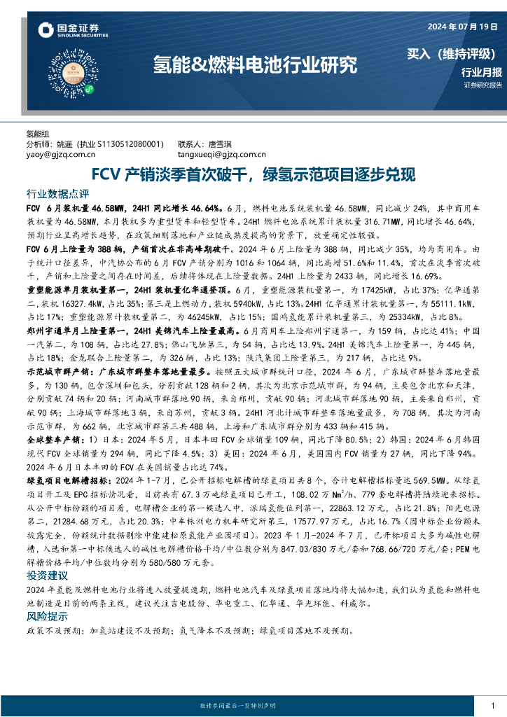 国金证券:氢能&燃料电池行业研究:FCV产销淡季首次破千,绿氢示范项目逐步兑现.pdf