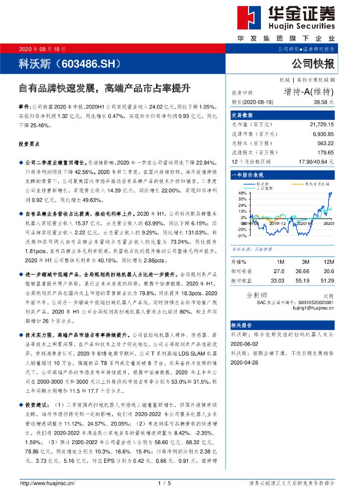 华金证券:科沃斯(603486)-自有品牌快速发展,高端产品市占率提升.pdf