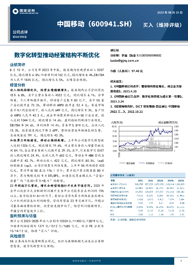 国金证券:中国移动(600941)-数字化转型推动经营结构不断优化.pdf