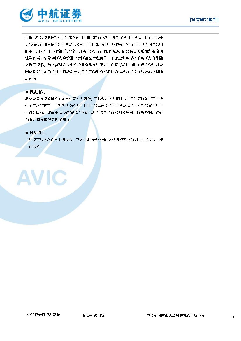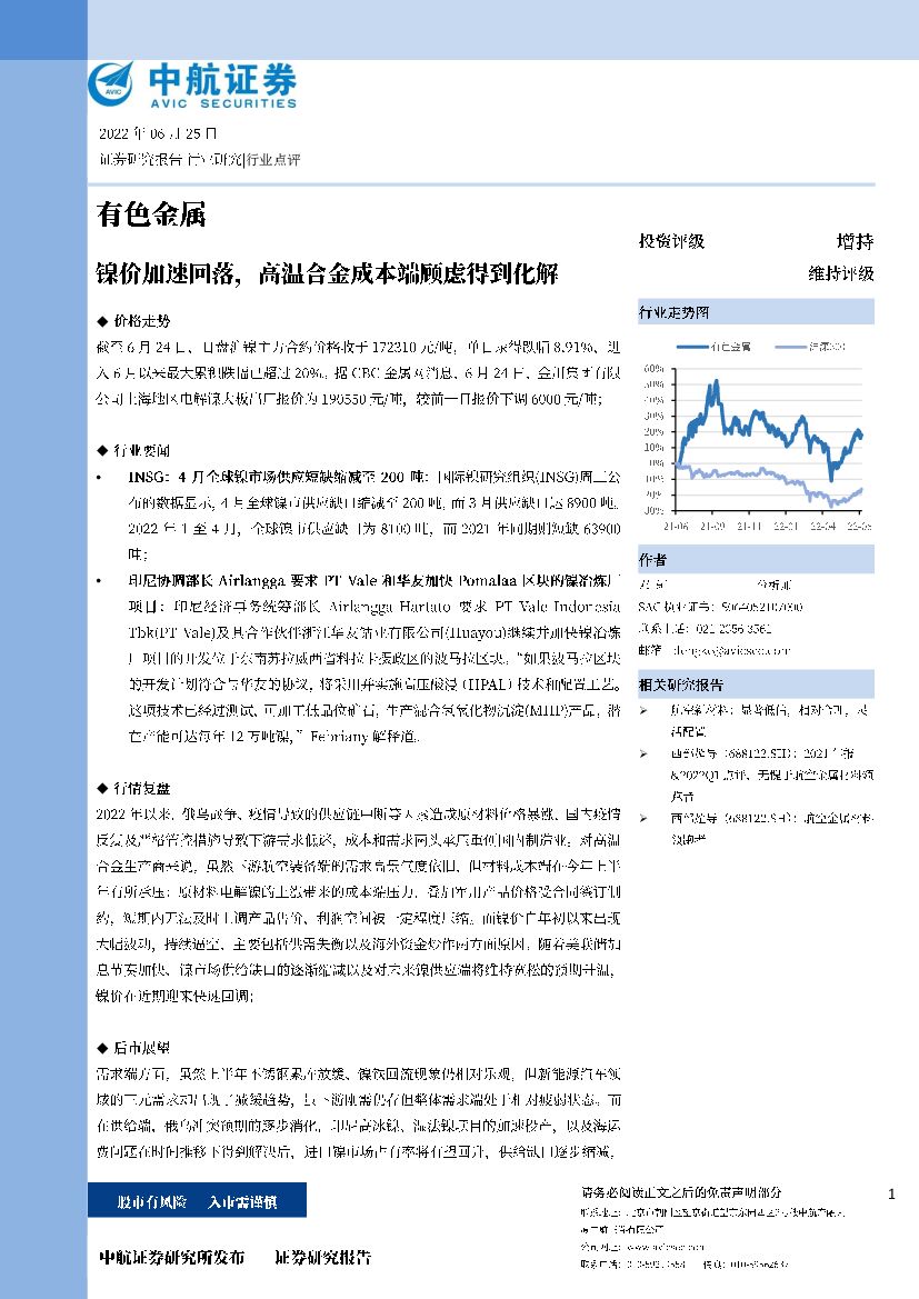 中航证券:有色金属:镍价加速回落,高温合金成本端顾虑得到化解.pdf