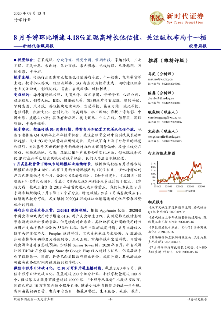 新时代证券:新时代传媒周报:8月手游环比增速4.18%呈现高增长低估值,关注版权布局十一档.pdf