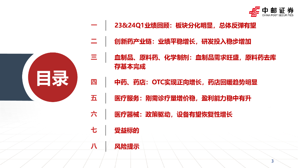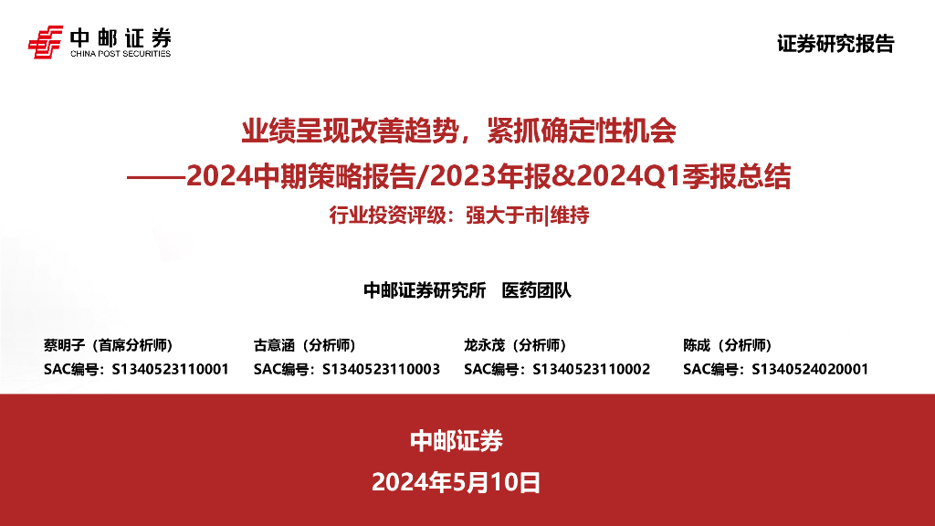 中邮证券:医药2024中期策略报告/2023年报&2024Q1季报总结:业绩呈现改善趋势,紧抓确定性机会.pdf