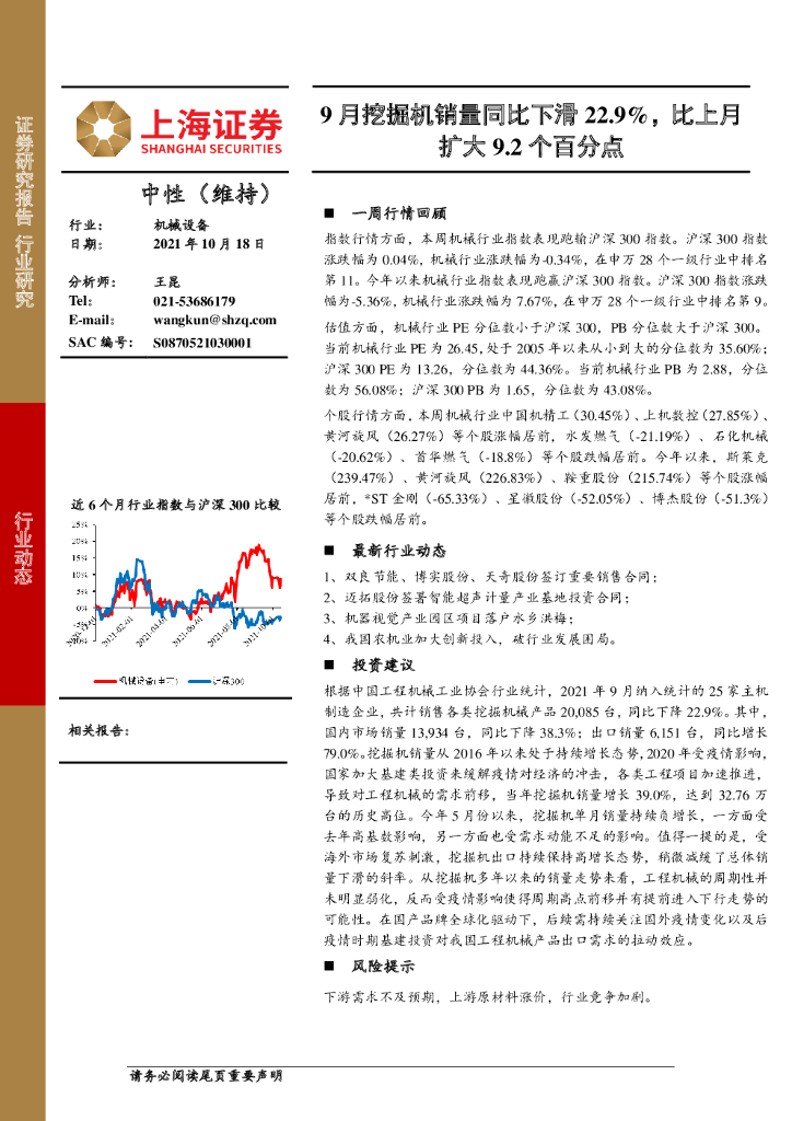 上海证券:机械设备:9月挖掘机销量同比下滑22.9%,比上月扩大9.2个百分点.pdf