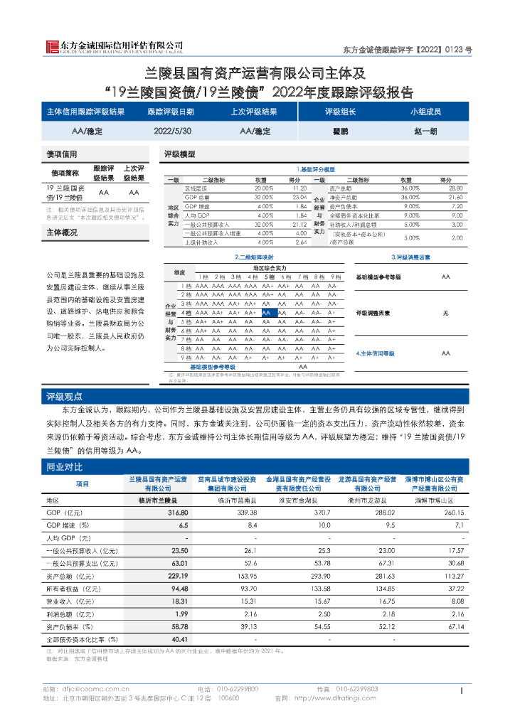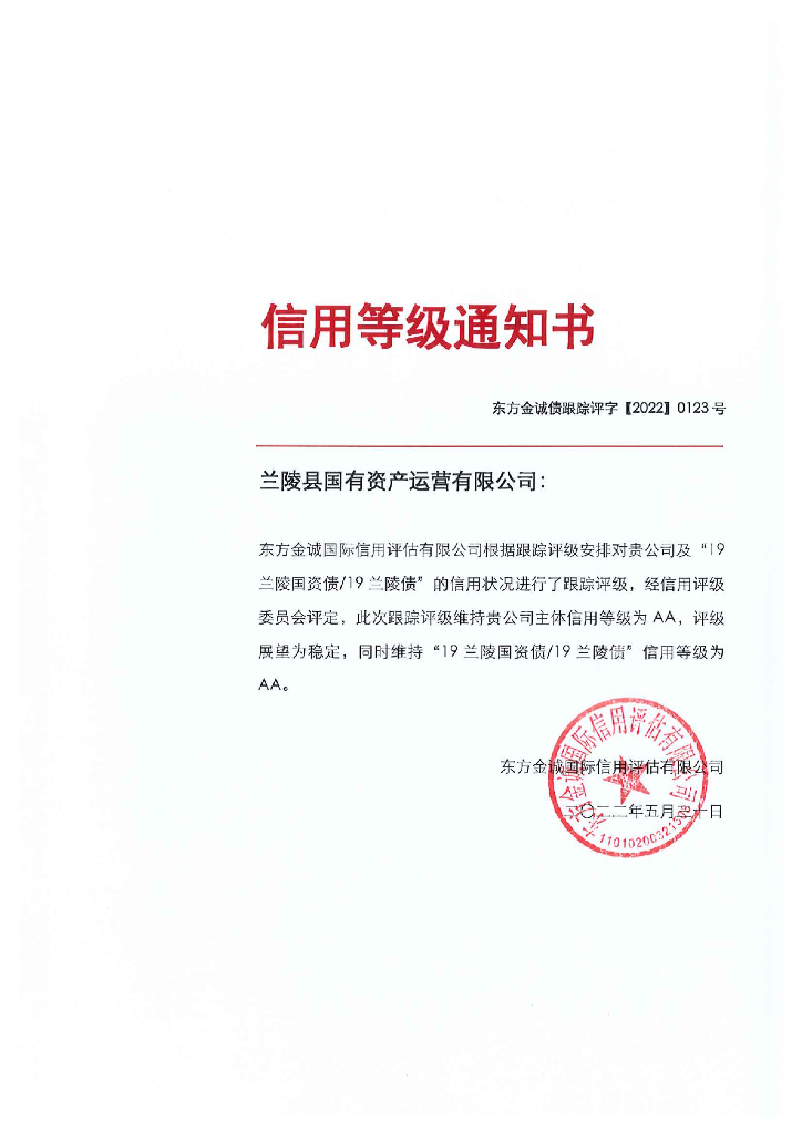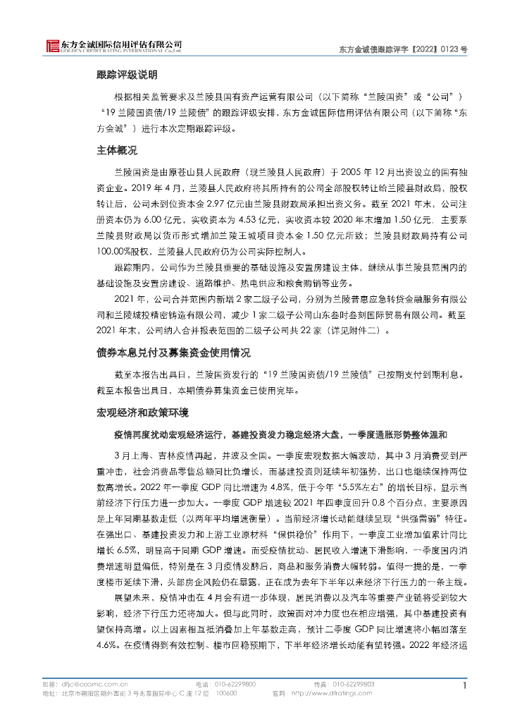 东方金诚:兰陵县国有资产运营有限公司主体及“19兰陵国资债19兰陵债”2022年度跟踪评级报告.pdf
