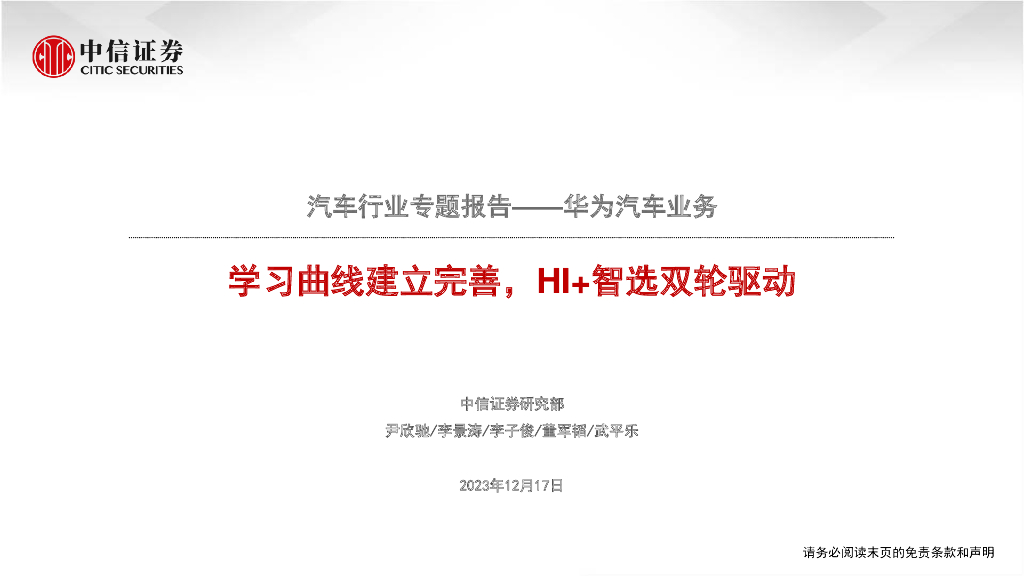 中信证券:华为汽车业务专题报告:学习曲线建立完善,HI+智选双轮驱动.pdf