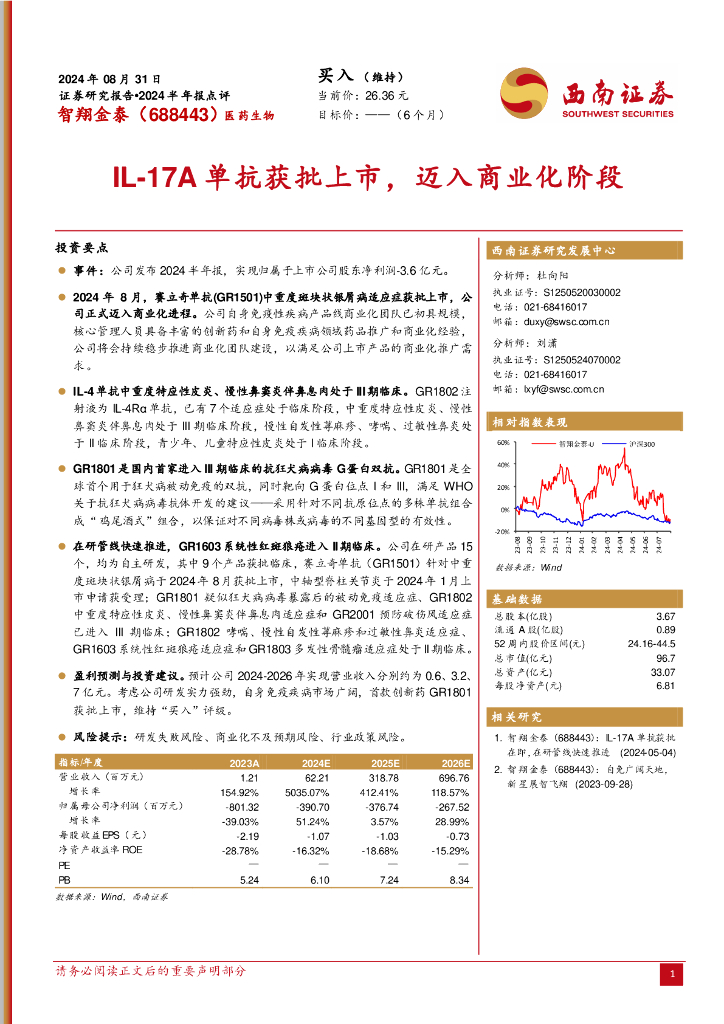 西南证券:智翔金泰(688443)-2024半年报点评:IL-17A单抗获批上市,迈入商业化阶段.pdf