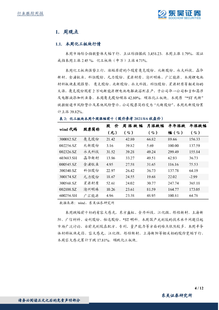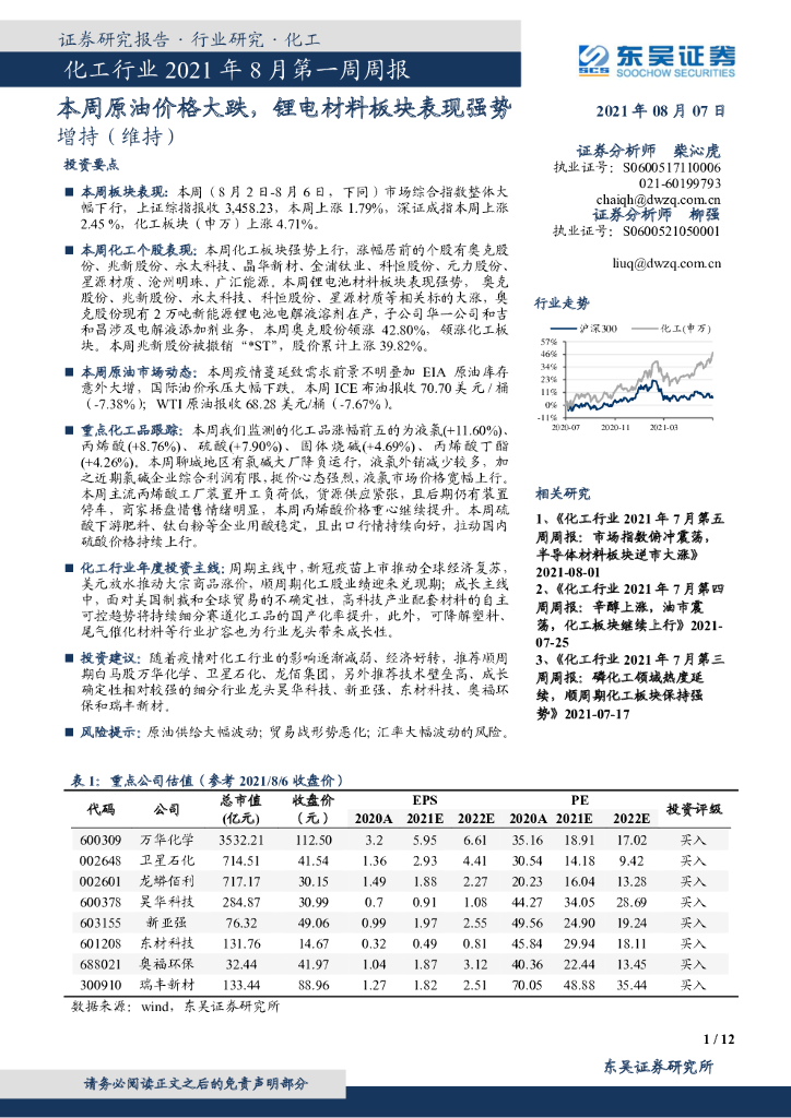 东吴证券:化工行业2021年8月第一周周报:本周原油价格大跌,锂电材料板块表现强势.pdf