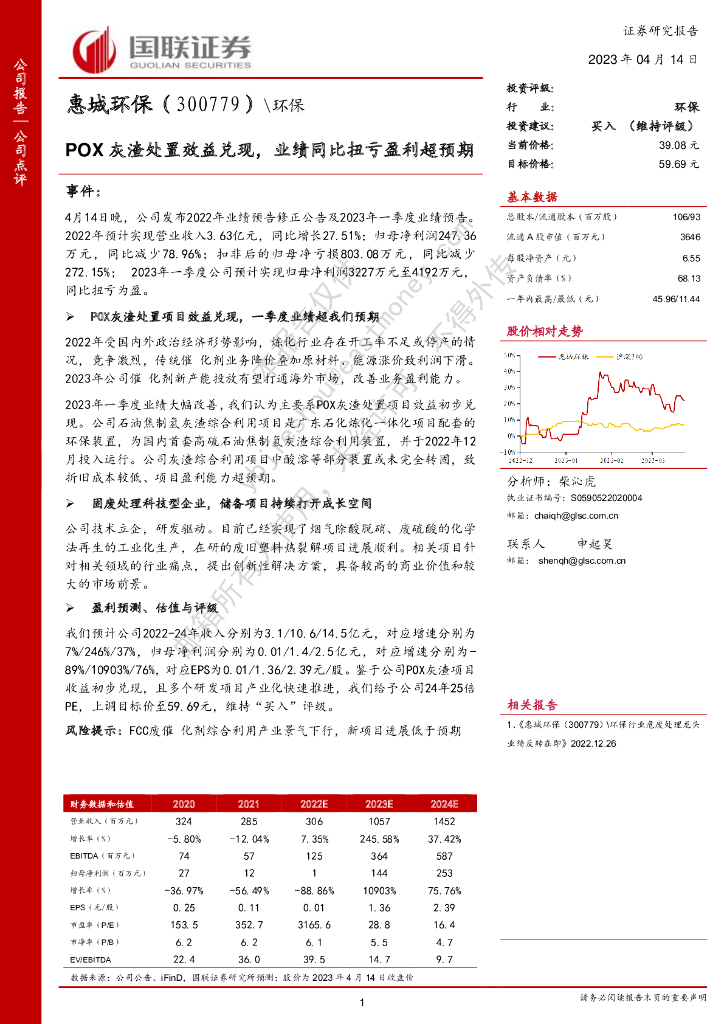 国联证券:惠城环保(300779)-POX灰渣处置效益兑现,业绩同比扭亏盈利超预期.pdf