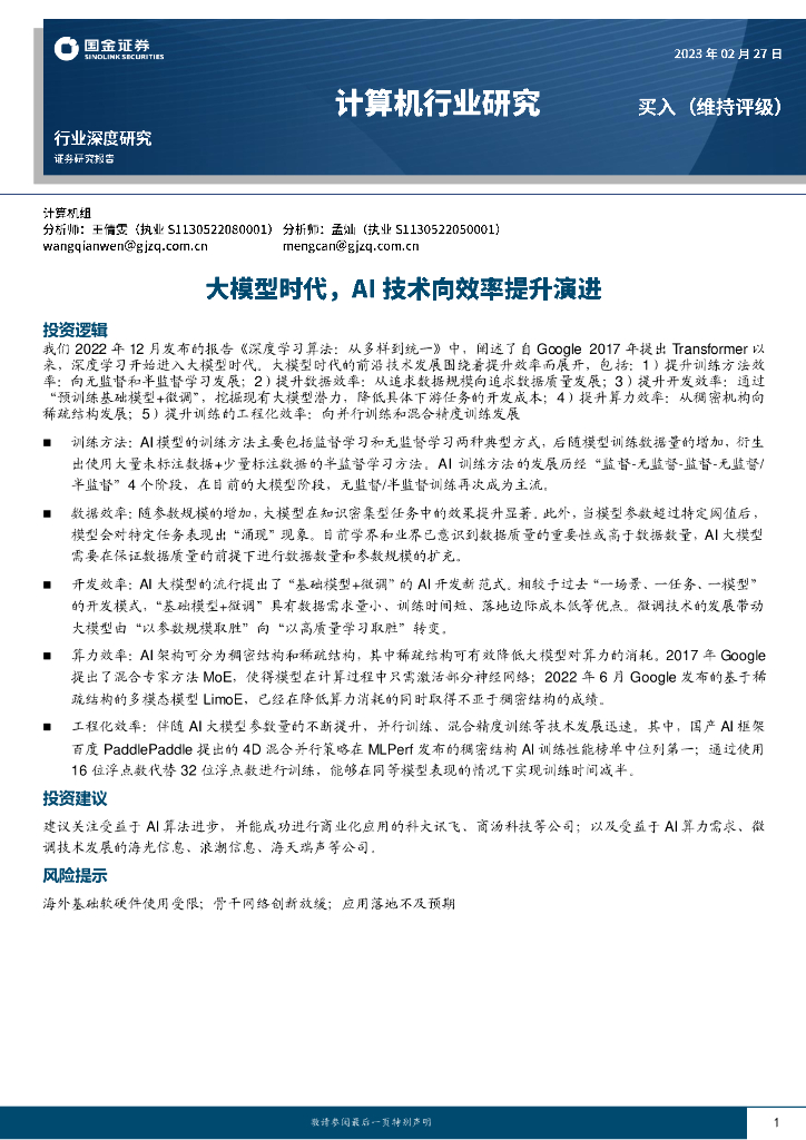 国金证券:计算机行业研究:大模型时代,AI技术向效率提升演进.pdf