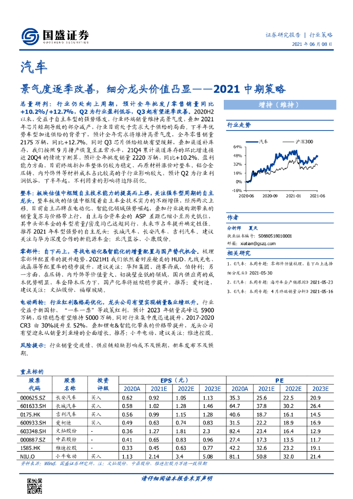 国盛证券:汽车2021中期策略:景气度逐季改善,细分龙头价值凸显.pdf
