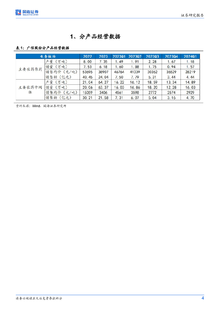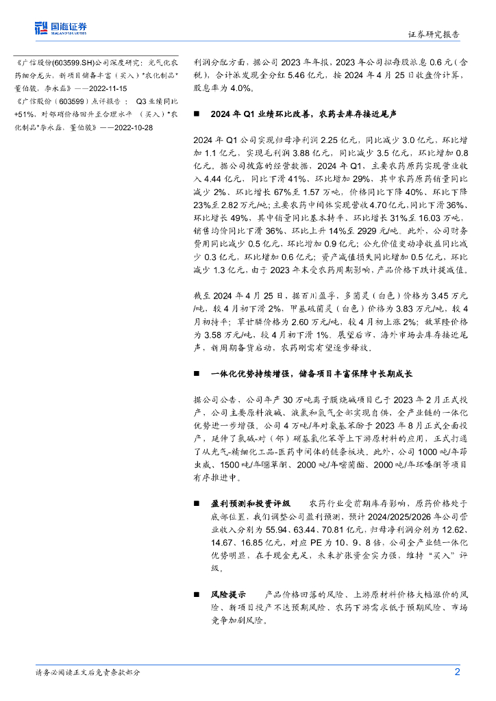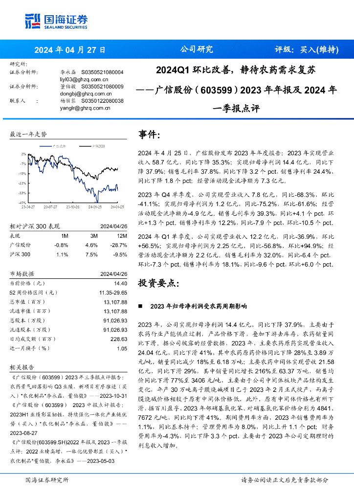 国海证券:广信股份(603599)-2024Q1环比改善,静待农药需求复苏2023年年报及2024年一季报点评.pdf