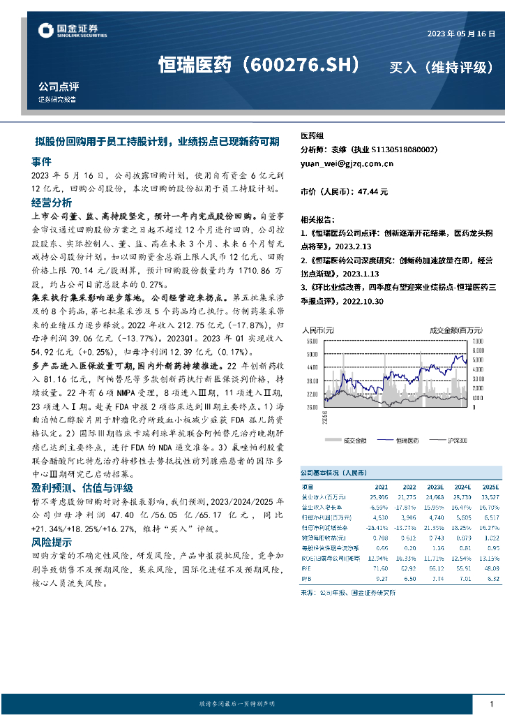 国金证券:恒瑞医药(600276)-拟股份回购用于员工持股计划,业绩拐点已现新药可期.pdf