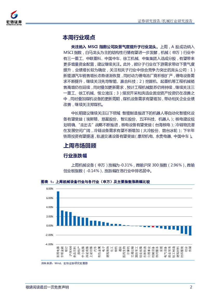 宏信证券:机械行业周报:关注纳入MSCI指数公司及景气度提升子行业龙头.pdf