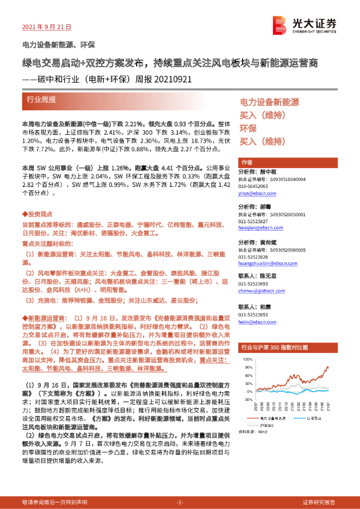 光大证券:碳中和行业(电新+环保)周报:绿电交易启动+双控方案发布,持续重点关注风电板块与新能源运营商.pdf