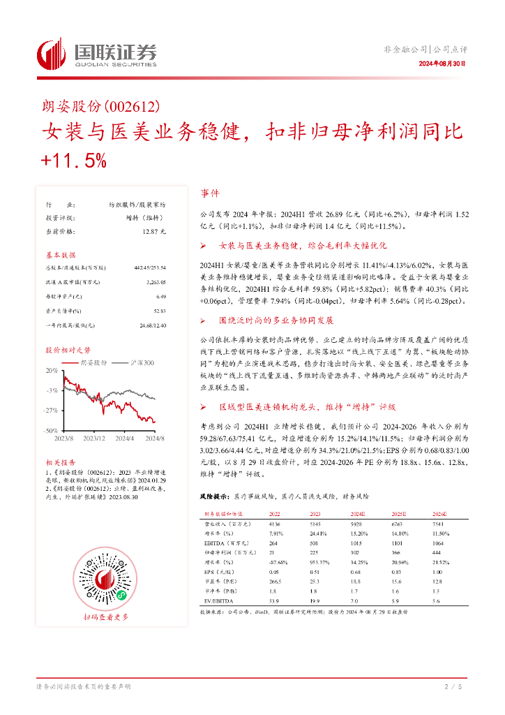 国联证券:朗姿股份(002612)-女装与医美业务稳健,扣非归母净利润同比+11.5%.pdf