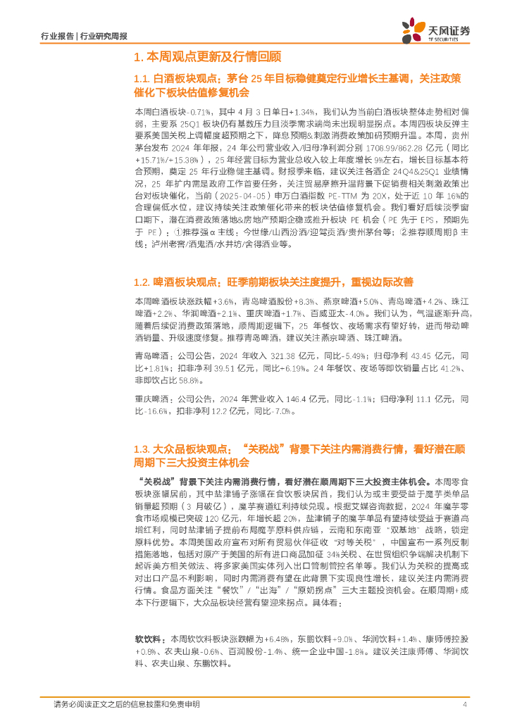 天风证券:食品饮料行业周报:茅台25年目标稳健奠定行业增长主基调,关注内需消费行情.pdf