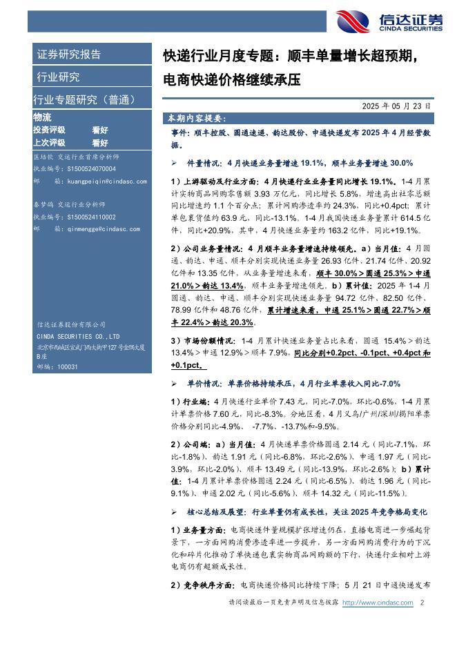 信达证券:快递行业月度专题:顺丰单量增长超预期,电商快递价格继续承压.pdf