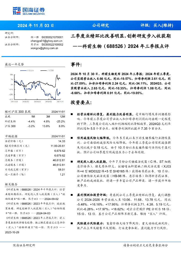 国海证券:科前生物(688526)-2024年三季报点评:三季度业绩环比改善明显,创新研发步入收获期.pdf