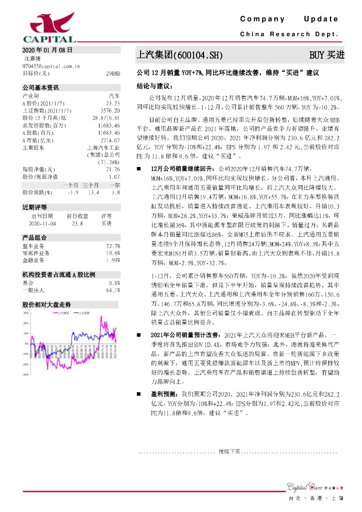 群益证券:上汽集团(600104)-公司12月销量YOY+7%,同比环比继续改善,维持“买进”建议.pdf