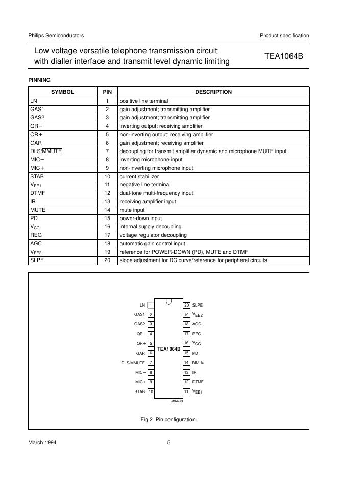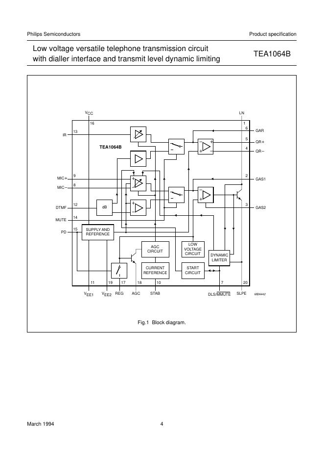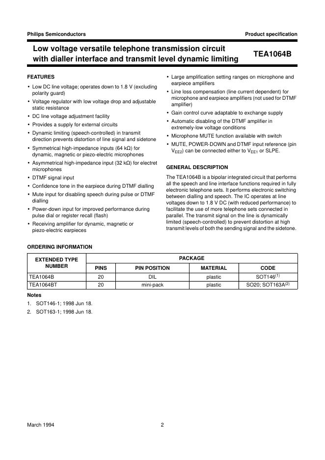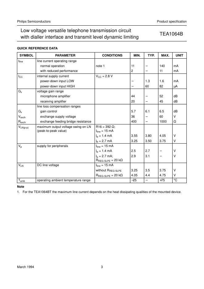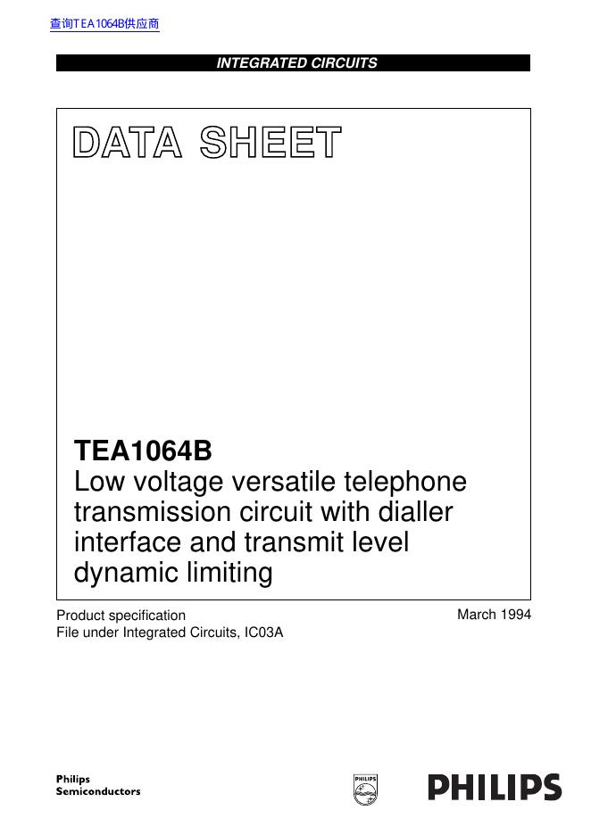 PHILIPS TEA1064B Low voltage versatile telephone transmission circuit with dialler interface and transmit level dynamic limiting 数据手册.pdf