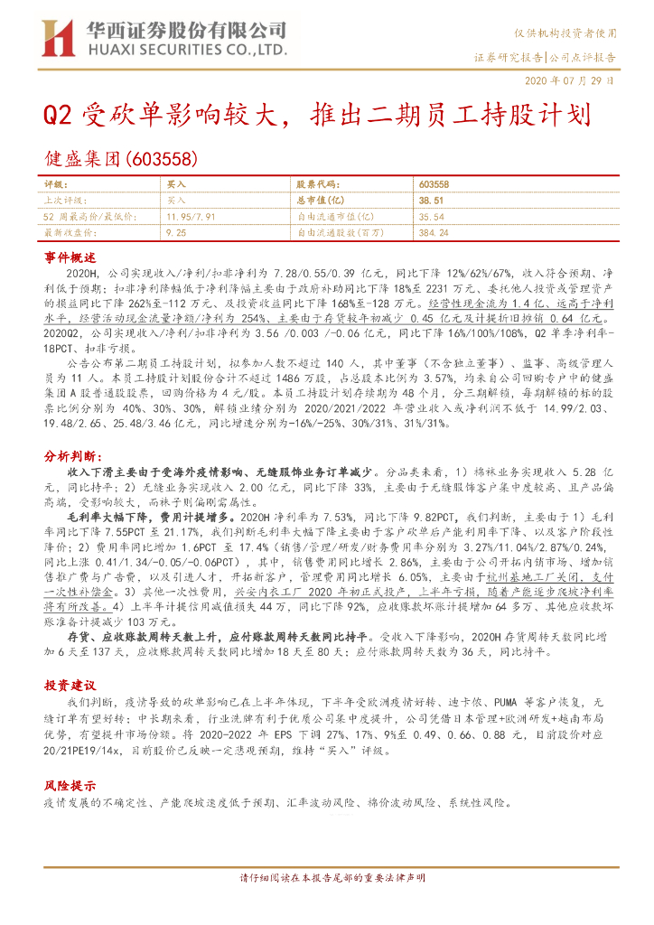 华西证券:健盛集团(603558)-Q2受砍单影响较大,推出二期员工持股计划.pdf