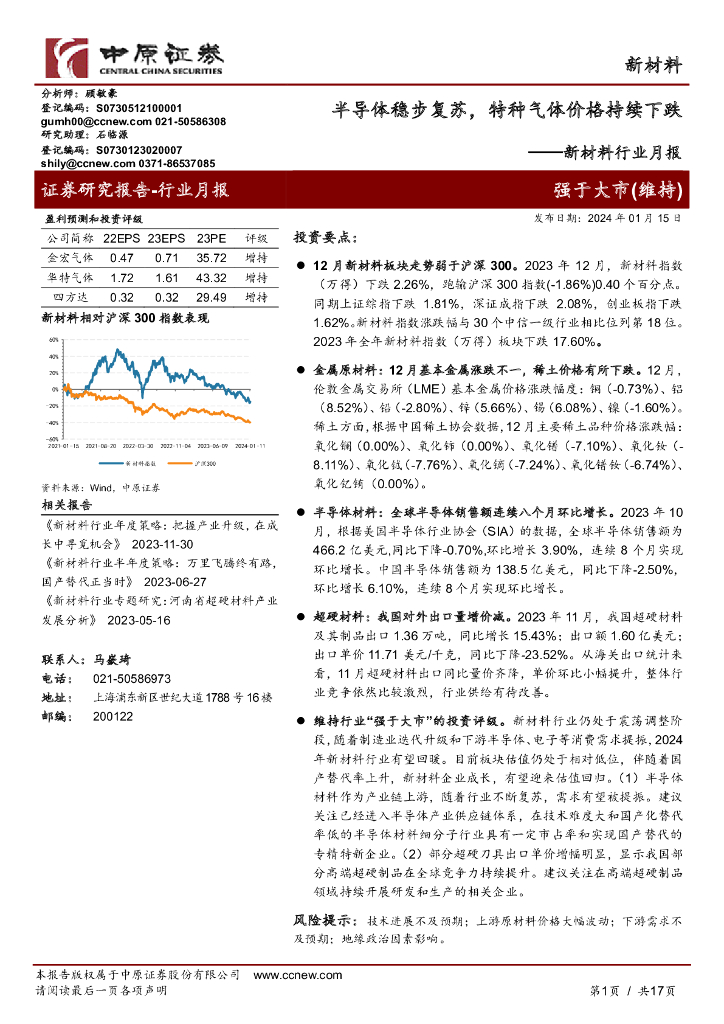 中原证券:新材料行业月报:半导体稳步复苏,特种气体价格持续下跌.pdf