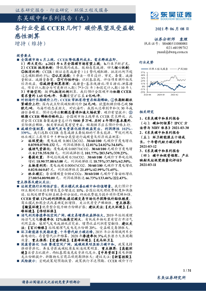 东吴证券:东吴碳中和系列报告(九):各行业受益CCER几何?碳价展望及受益敏感性测算.pdf