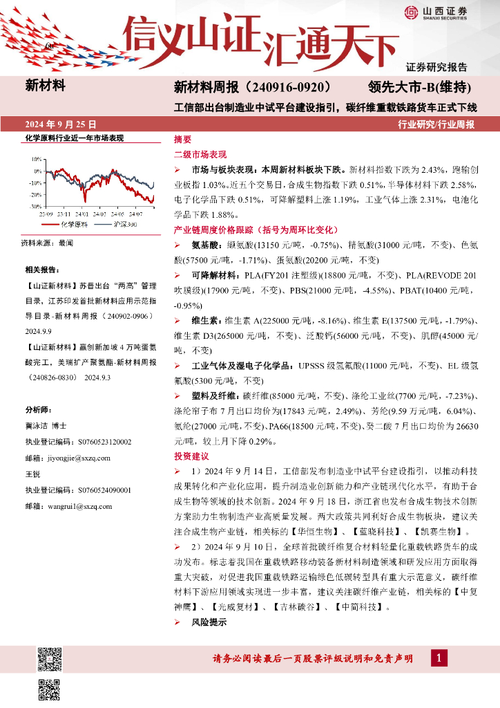 山西证券:新材料行业周报:新材料周报(240916-0920)工信部出台制造业中试平台建设指引,碳纤维重载铁路货车正式下线.pdf
