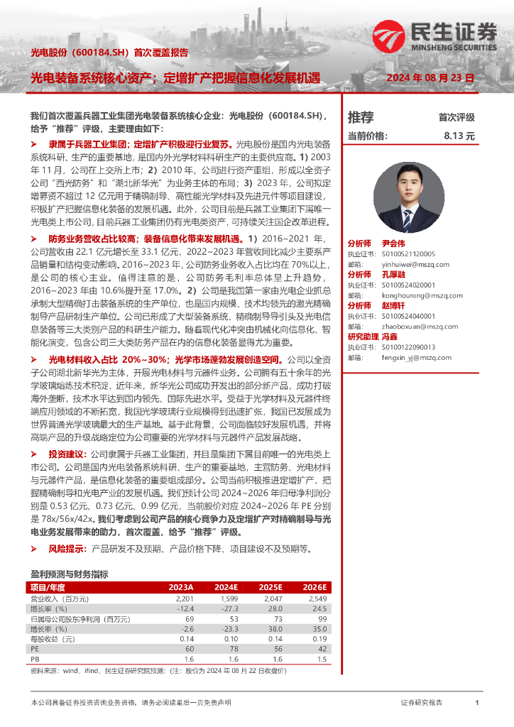 民生证券:光电股份(600184)-首次覆盖报告:光电装备系统核心资产;定增扩产把握信息化发展机遇.pdf