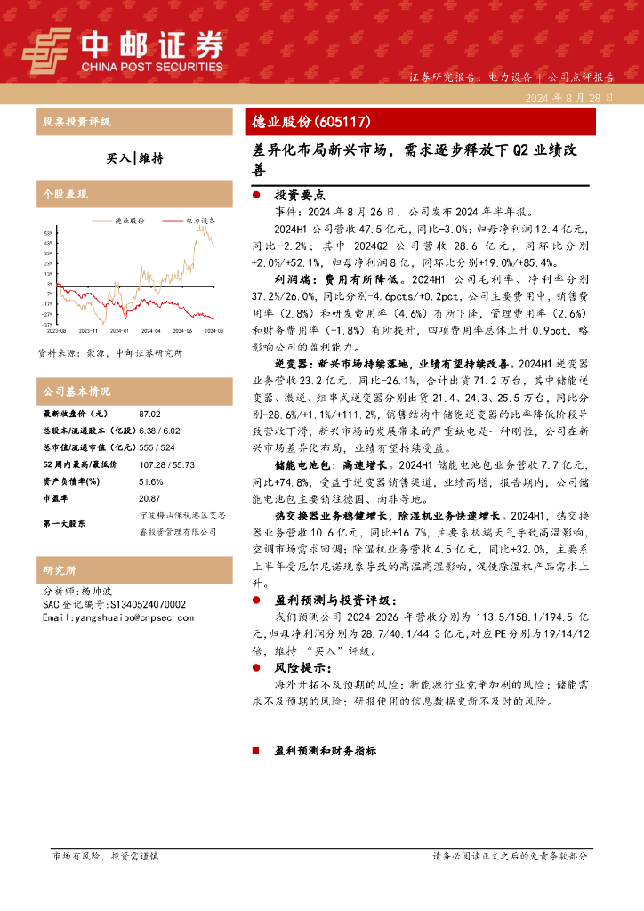 中邮证券:德业股份(605117)-差异化布局新兴市场,需求逐步释放下Q2业绩改善.pdf