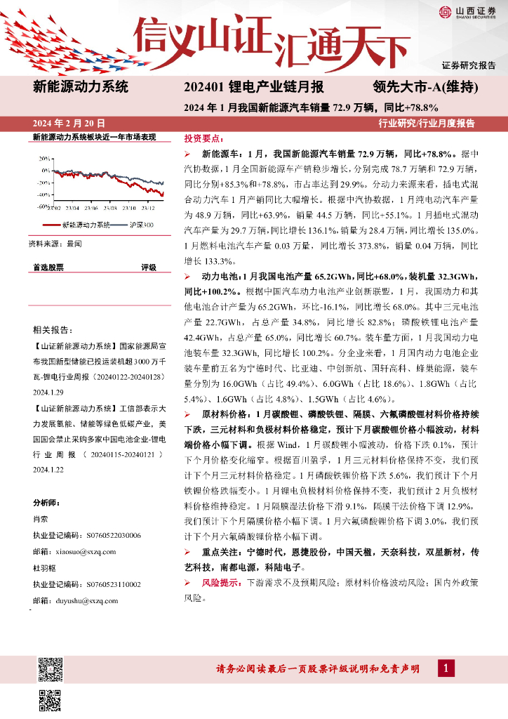 山西证券:202401锂电产业链月报:2024年1月我国新能源汽车销量72.9万辆,同比+78.8%.pdf