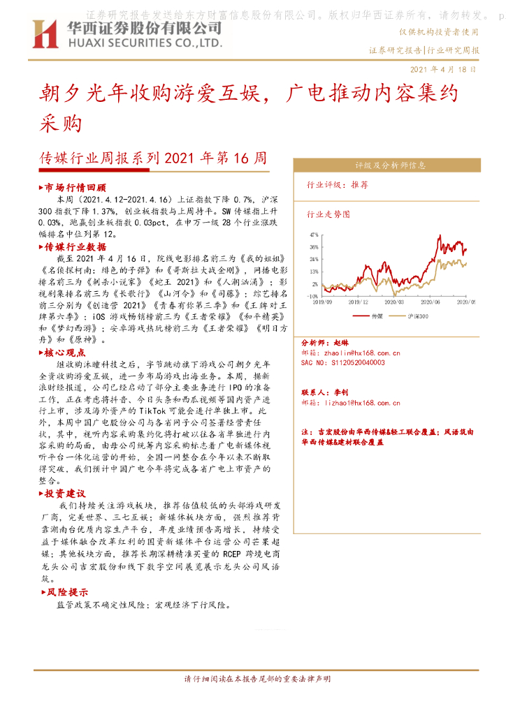 华西证券:传媒行业周报系列2021年第16周:朝夕光年收购游爱互娱,广电推动内容集约采购.pdf