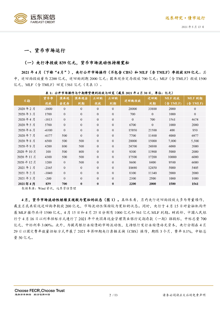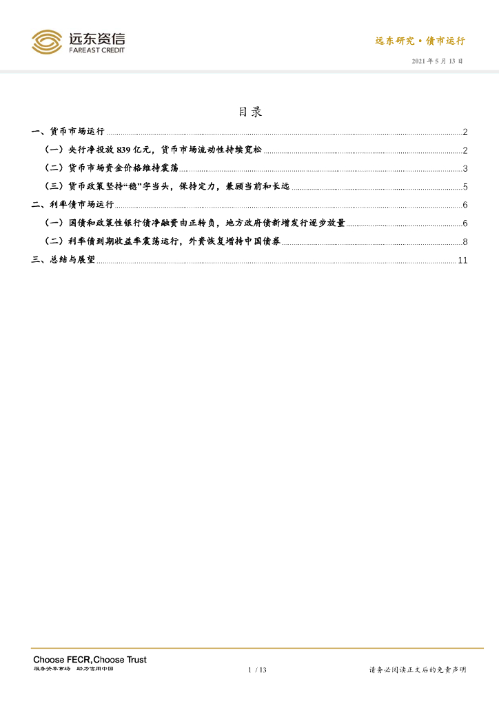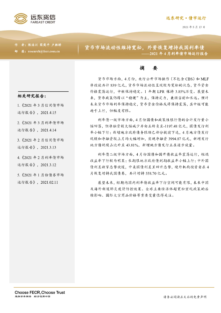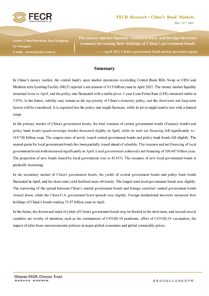 远东资信: 2021年4月利率债市场运行报告:货币市场流动性维持宽松,外资恢复增持我国利率债.pdf