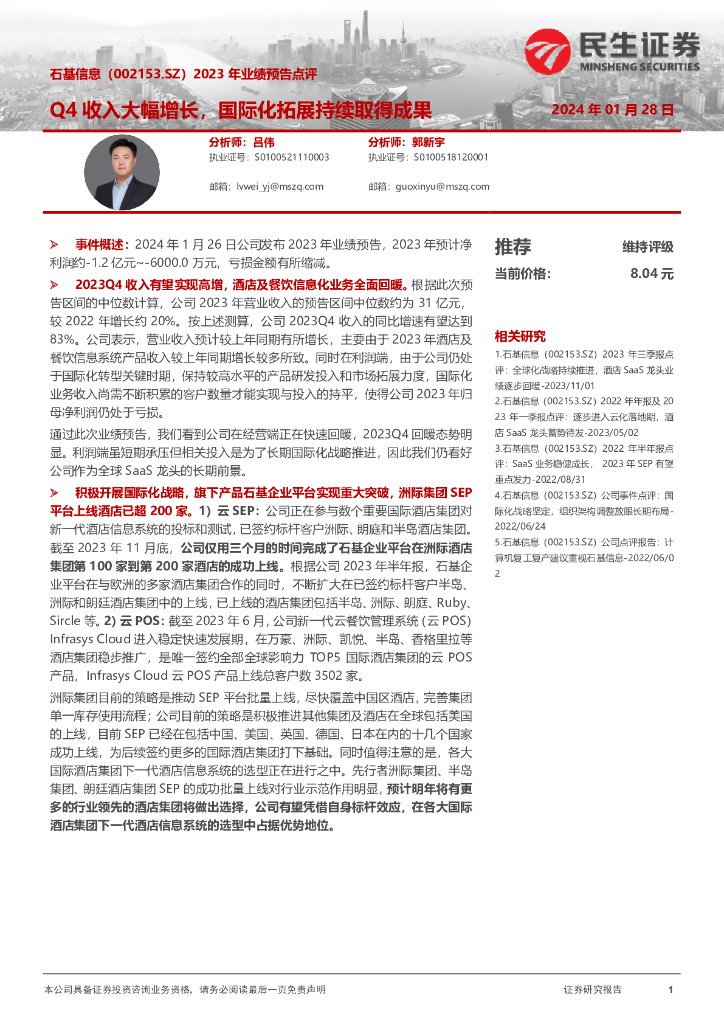 民生证券:石基信息(002153)-2023年业绩预告点评:Q4收入大幅增长,国际化拓展持续取得成果.pdf