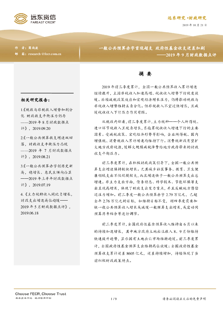 远东资信:一般公共预算赤字首现超支,政府性基金收支逆差加剧——2019年9月财政数据点评.pdf