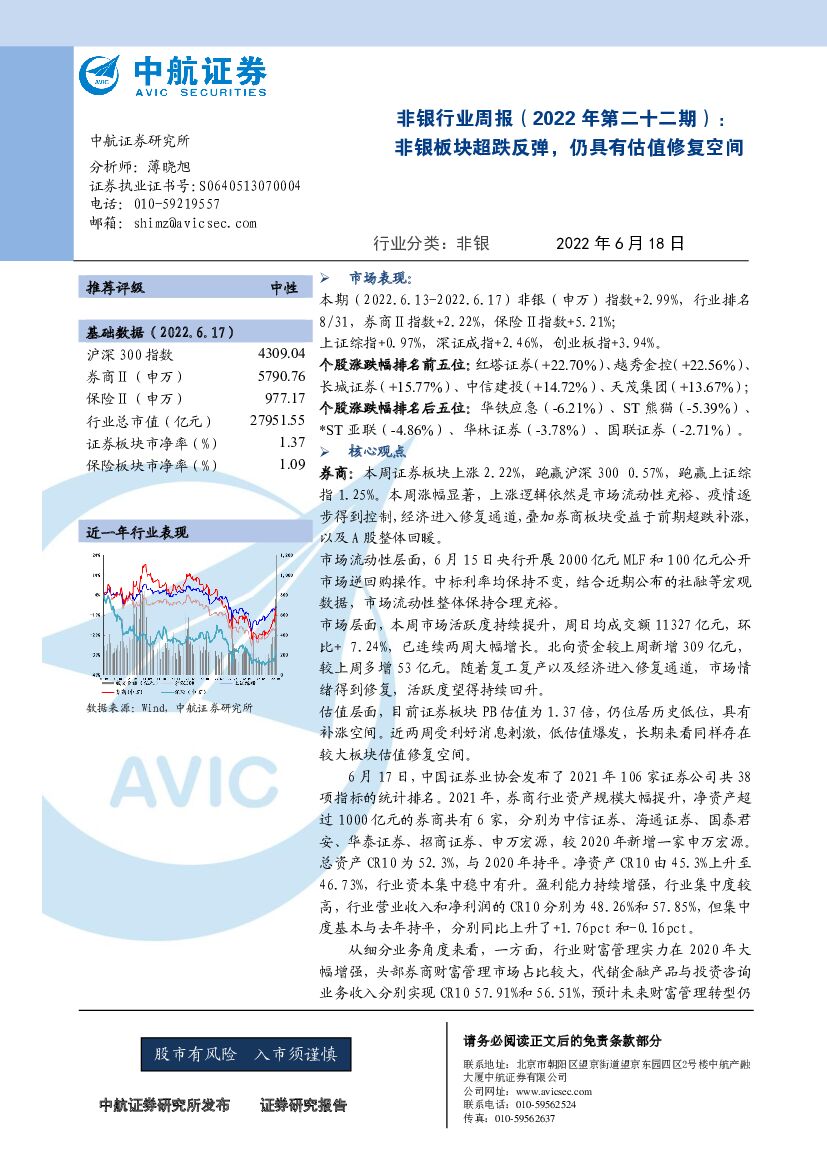 中航证券:非银行业周报(2022年第二十二期):非银板块超跌反弹,仍具有估值修复空间.pdf
