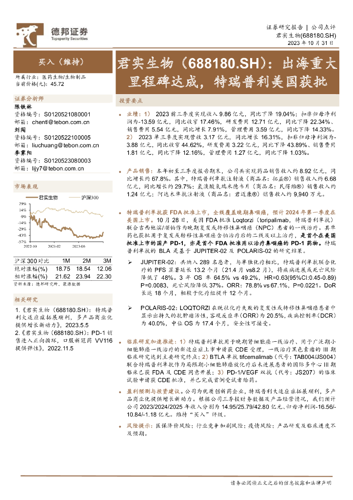 德邦证券:君实生物(688180)-出海重大里程碑达成,特瑞普利美国获批.pdf