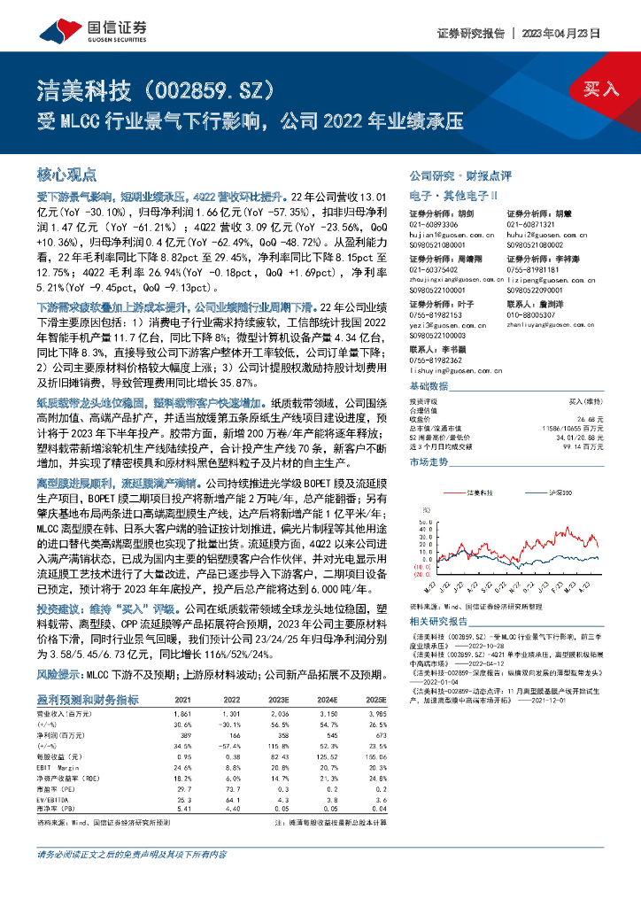 国信证券:洁美科技(002859)-受MLCC行业景气下行影响,公司2022年业绩承压.pdf