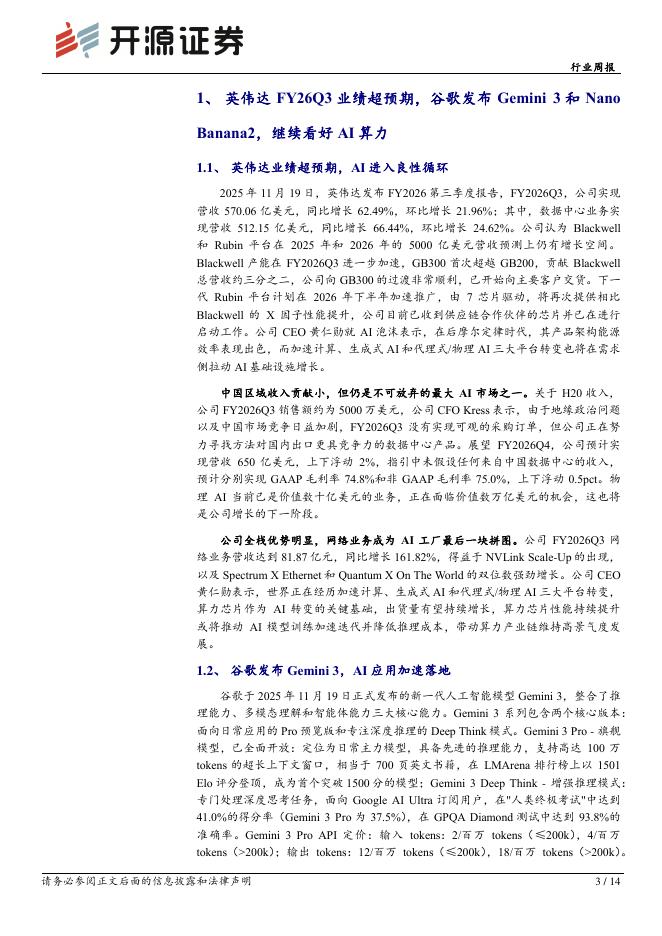 开源证券:通信行业周报:英伟达FY26Q3业绩超预期,谷歌发布Gemini3和NanoBanana2,继续看好AI算力.pdf