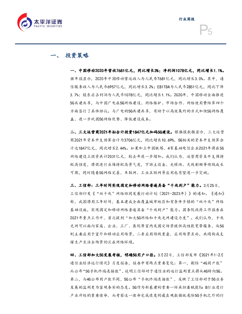 太平洋证券:通信行业周报:中移动将新建12万2.6GHz基站,运营商合计1847亿建设5G.pdf