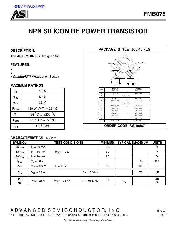 NPN SILICON RF POWER TRANSISTOR FMB075 数据手册.pdf