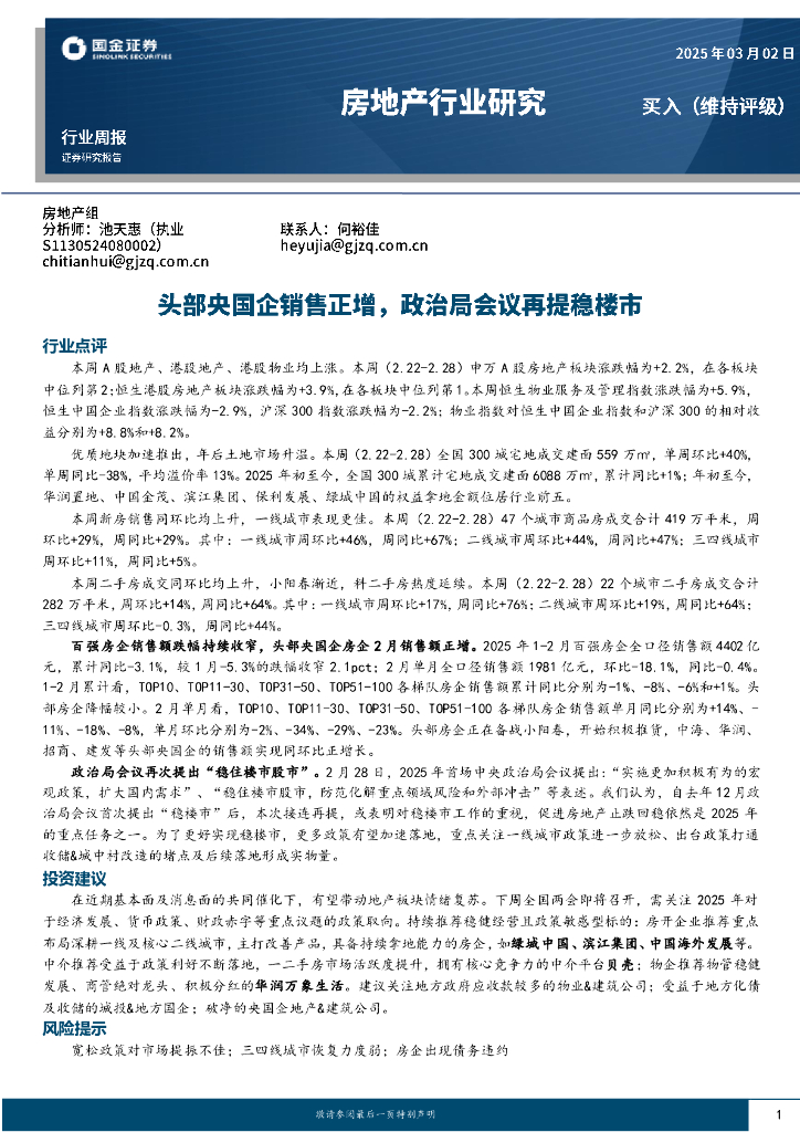 国金证券:房地产行业研究:头部央国企销售正增,政治局会议再提稳楼市.pdf