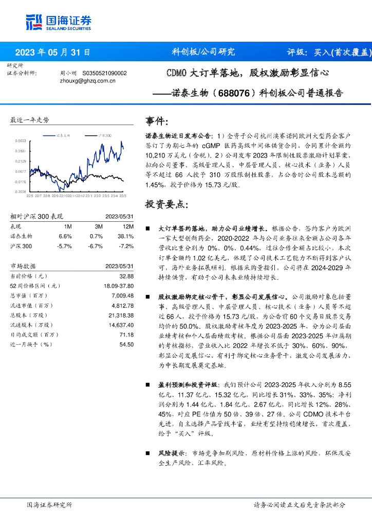 国海证券:诺泰生物(688076)-科创板公司普通报告:CDMO大订单落地,股权激励彰显信心.pdf