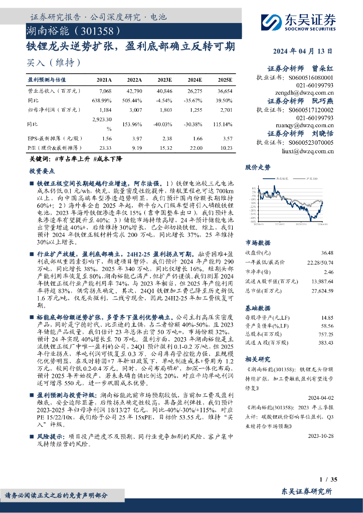 东吴证券:湖南裕能(301358)-铁锂龙头逆势扩张,盈利底部确立反转可期.pdf