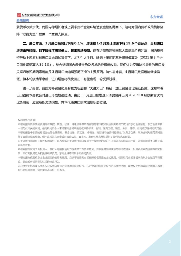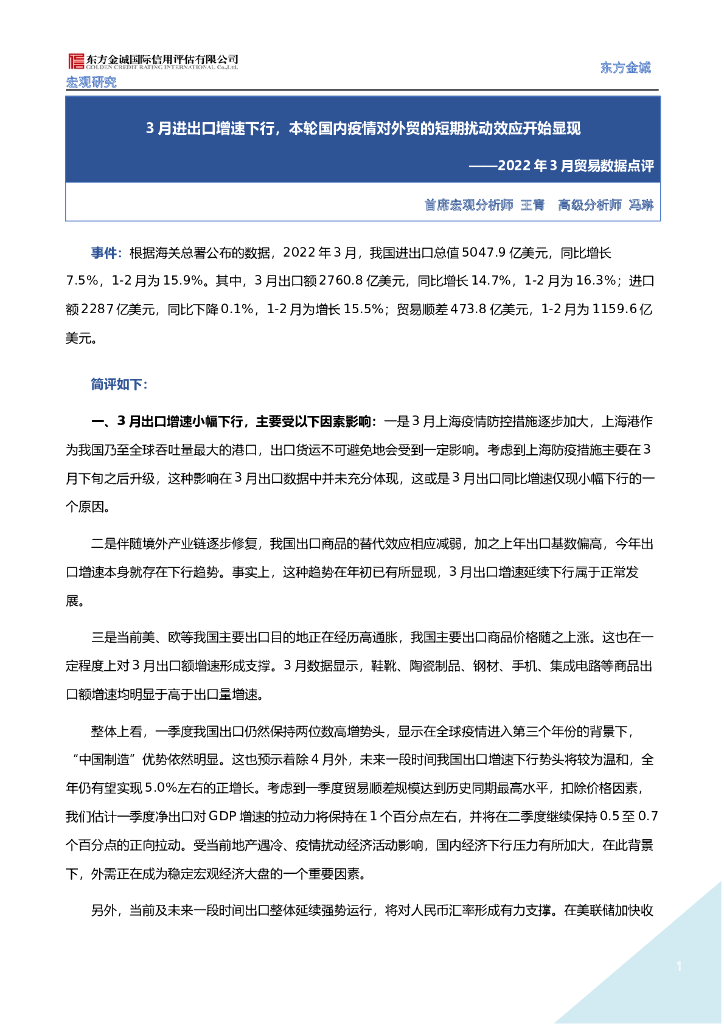 东方金诚:3月进出口增速下行,本轮国内疫情对外贸的短期扰动效应开始显现(2022年3月贸易数据点评).doc